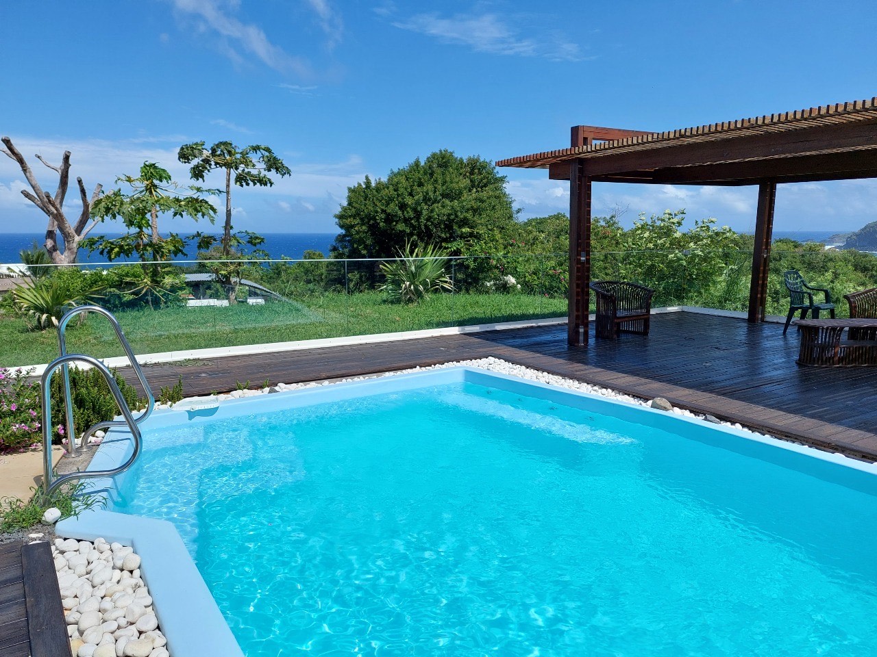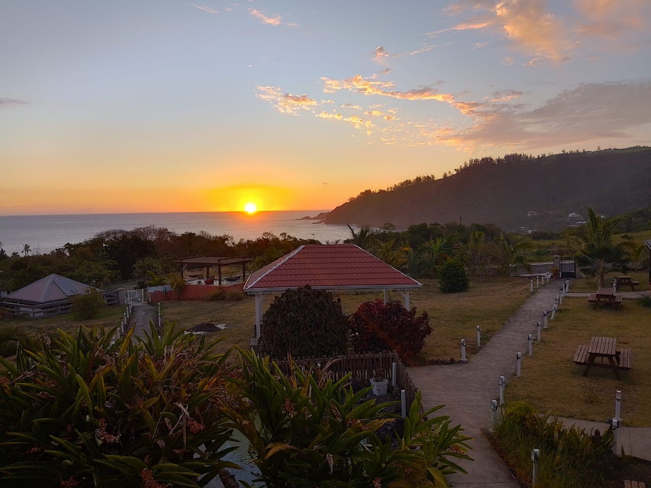 Avec sa structure ouverte et son charme créole, le kiosque permet de profiter du calme et de la beauté du paysage, tout en offrant un espace confortable et fonctionnel.