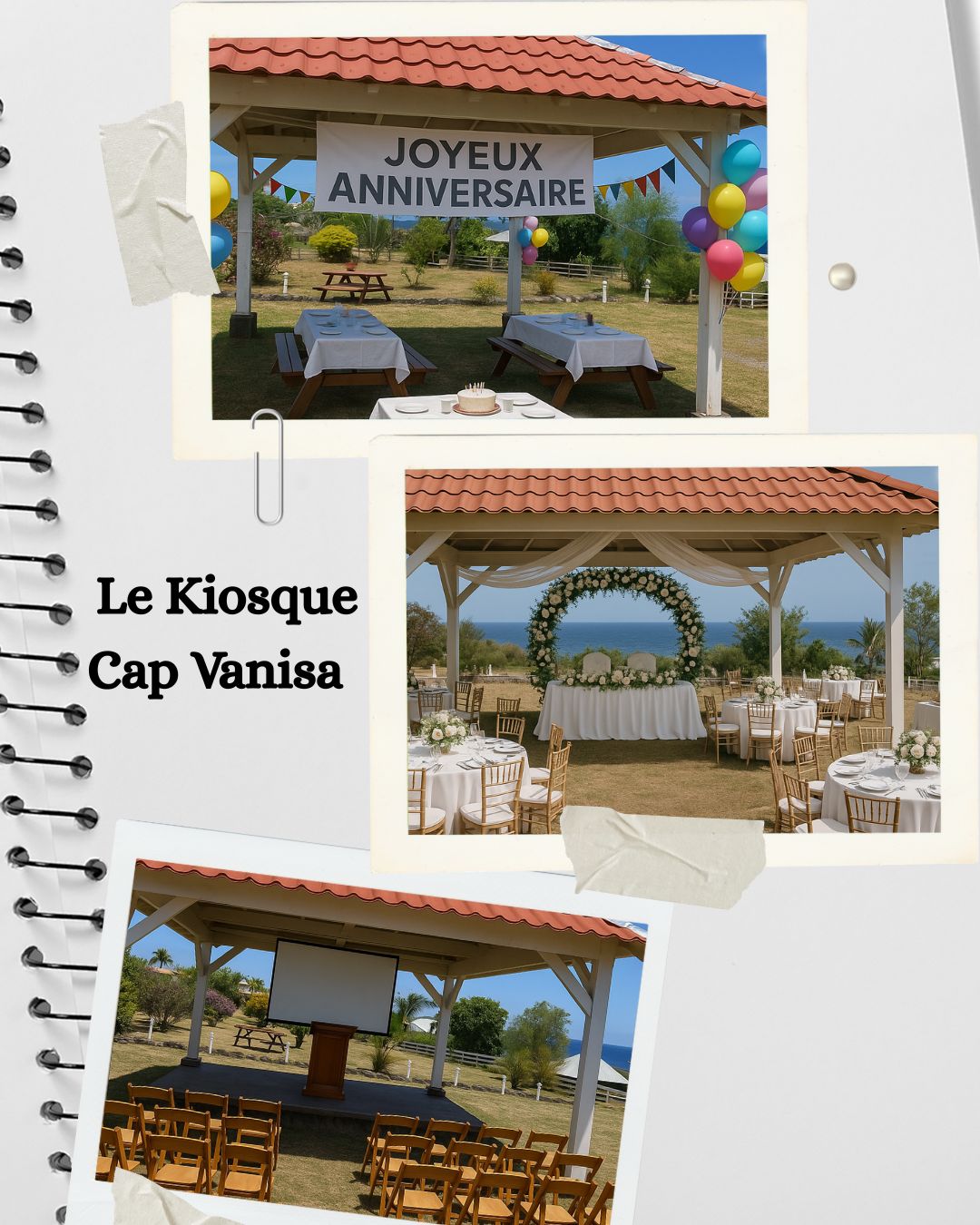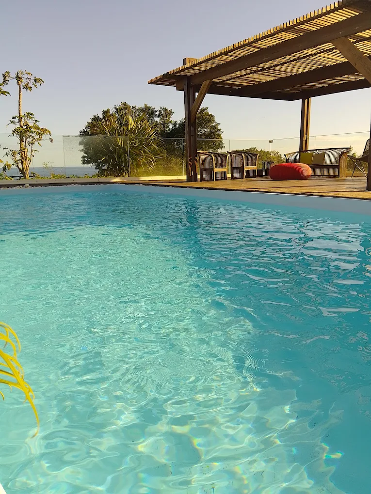 Avec sa structure ouverte et son charme créole, le kiosque permet de profiter du calme et de la beauté du paysage, tout en offrant un espace confortable et fonctionnel.